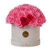 An intimate expression of romance, the Grande Love Dome is a study in elegance and restraint. At its heart, a sculptural double red rose shaped into a perfect heartbeat serves as the ultimate symbol of devotion, delicately encircled by pink Lifetime roses. Each bloom is meticulously preserved to maintain its beauty, creating a design meant to be admired long after the moment has passed.